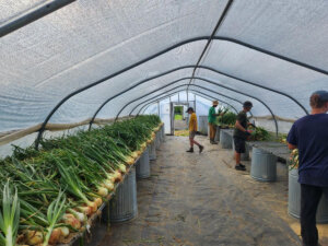 The other onion varieties will go directly into our curing hoop houses after harvest. The curing process involves laying out all the onions on grates with their stems still on. After the stems are fully dry we will cut them off and bag the onions to share out over the next few months. We try to grow as many onions as possible because we know they are quite a popular item!